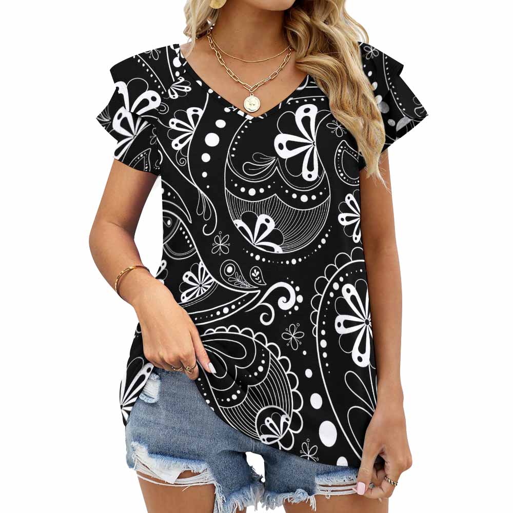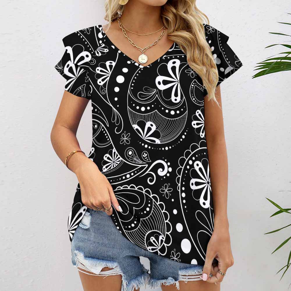 Chinese name:Ruffled Short Sleeve V-Neck T-Shirt BUT-(Customizable Pattern Optional)